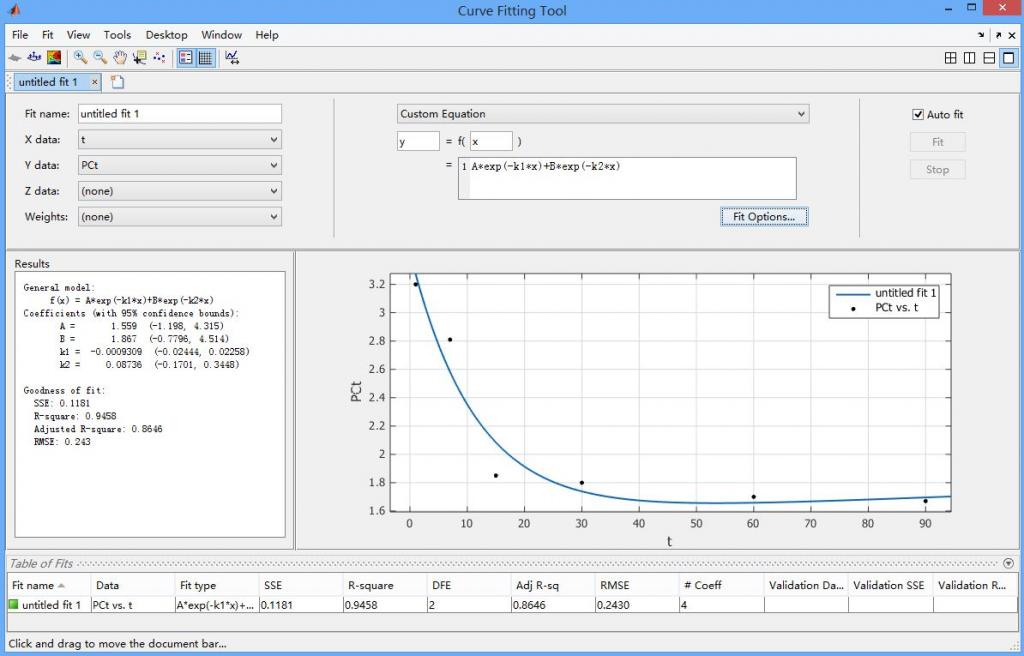 需要拟合的方程:PC(t)=A*e(-k1*t) +B*e(-k2*t)