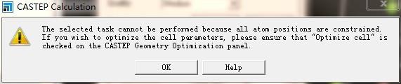 Laves相C-15的MgCu2晶格的空间群是FD3M,然后直接加入原子,构成了MgCu2的结构,建立的时候都是默认的参数,点几何优化的时候总是提示,位置不能被执行,所有原子位置限制,应该怎么改? 提示.jpg |