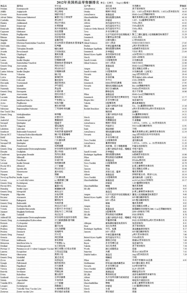 TOP100:2012年美国畅销药零售额排名