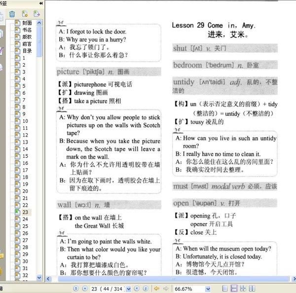 内容简介: 大家都在说,《新概念英语》虽然经典,却在口语上有薄弱点。让我们看看,这《会说话的新概念英语单词(1-4册合集)》如何帮助大家突破瓶颈-- 《会说话的新概念英语单词(1-4册合集)》的特色在于,单词除释义与拓展外,还配有原汁原昧的口语小对话,所有对话,均选材于编者多年国外生活和工作的积累,以及英美影视大片、报纸、网络、原版英文访谈,可谓绝对地道,绝对实用。为培养真实语感,每则对话均配有外教朗读的MP3录音文件。相信这样的独到安排定能帮助读者准确掌握《新概念英语》词汇,并迅速提升口语听说能力。 目录: 第1册入门与温故 Lesson 1 Excuse me!对不起! Lesson 2 Is this your…?这是你的……吗? Lesson 3 Sorry,sir.对不起,先生。, Lesson 4 Is this your…?这是你的……吗? Lesson 5 Nice to meet you.很高兴见到你。 Lesson 6 What make is it?它是什么牌子的? Lesson 7 Are you a teacher?你是教师吗? Lesson 8 What’you job?你是做什么工作的? Lesson 9 How are you today?你今天好吗? Lesson 10 Look at…看……, Lesson 1 1 Is this your shirt?这是你的衬衫吗? Lesson 12 Whose is this…?This is my/your/his/her…这……是谁的?这是我的/他的/她的……Whose is that…?This is my/your/his/her…那……是谁的?那是我的/你的/他的,她的…… Lesson 13 A new dress一件新连衣裙 Lesson 14 What colour is your…?你的……是什么颜色的? Lesson 15 Your passports,please.请出示你们的护照。 Lesson 16 Are you…?你们是……吗? Lesson 17 How do you do?你好! Lesson 19 Tired and thirsty又累又渴 .. [ 来自科研家族 皇家神龙教 ] |
