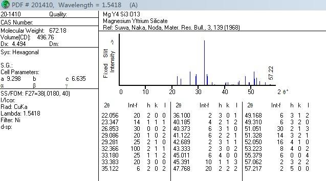 各位虫友你们好,我想找Mg2Y8(SiO4)6O2这种晶体的晶格结构和其中各原子的位置,貌似有些数据库可以查到,但是我们学校没有购买这方面的数据库,恳请大家帮忙,替我找一下。谢谢,下面图中是在pdf2002里面找到的相关资料,供参考: