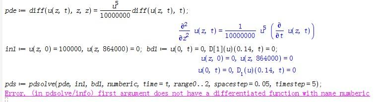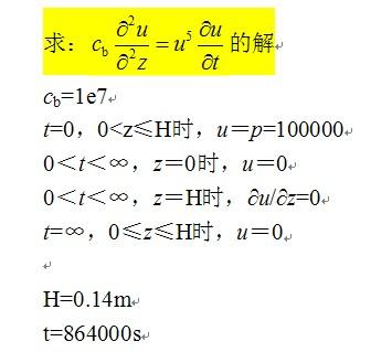 偏微分方程如下: 偏微分方程.jpg 好几个月了,一直弄不出来!matlab跟maple都试过了! 下面是用maple写的,但是出错了,麻烦帮忙看下: Maple.jpg [ Last edited by 土木小和尚 on 2013-4-8 at 16:58 ] |