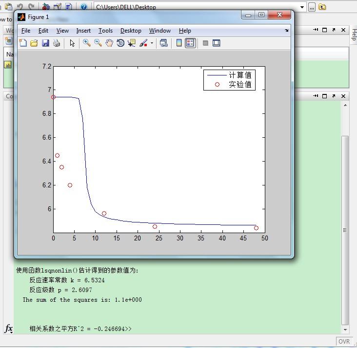 第一个方程 %--------------------------start----------------------------------------- function ode2 clear all;clc format long tspan=[0 1 2 4 12 24 48]; t1=length(tspan), yexp=[6.45 6.35 6.2 5.96 5.85 5.84]'; t2=length(yexp) y0=6.94; k0=[2]; lb=[-1]*1e3; ub=[1]*1e3; yy=[y0 yexp']; [k,resnorm,residual,exitflag,output,lambda,jacobian] = ... lsqnonlin(@ObjFunc,k0,lb,ub,[],tspan,y0,yexp); ci = nlparci(k,residual,jacobian); fprintf('\n\n使用函数lsqnonlin()估计得到的参数值为:\n') fprintf('\t反应速率常数 k = %.4f\n',k(1)) %fprintf('\t反应级数 n = %.4f\n',k(2)) fprintf(' The sum of the squares is: %.1e\n\n',resnorm) ts=0:1:max(tspan); [ts ys]=ode45(@KineticsEqs,ts,y0,[],k); [ttt XXsim] = ode45(@KineticsEqs,tspan,y0,[],k); y=XXsim(2:end); xexp=yexp; R2=1-sum((xexp-y).^2)./sum((xexp-mean(y)).^2); fprintf('\n\t相关系数之平方R^2 = %.6f',R2); plot(ts,ys,'b',tspan,yy,'or'),legend('计算值','实验值','Location','best'), %--------------------------------------------------------- function f = ObjFunc(k,tspan,y0,yexp) % 目标函数 [t Xsim] = ode45(@KineticsEqs,tspan,y0,[],k); ysim = Xsim(2:end); f=ysim-yexp; %---------------------------------------------------------- function dydt = KineticsEqs(t,y,k) c0=6.9401;cp=5.8399; dydt=-k(1)*(c0-y).^(1/3).*(y-cp); %--------------------The end------------------------------------------- |
