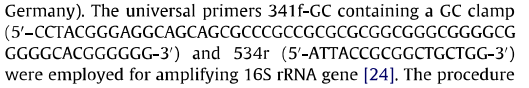 bacterial Q16S-1 F 5'-ACTCCTACGGGAGGCAGCAG-3' Q16S-1 R 5'-ATTACCGCGGCTGCTGG-3' Reference: Dynamics of bacterial communities during solid-state fermentation using agro-industrial wastes to produce poly-γ-glutamic acid, revealed by real-time PCR and denaturing gradient gel electrophoresis (DGGE) 我们实验室用的这个 |
