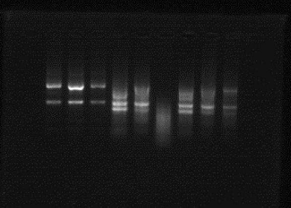 RNA要是只出现两条带,可以多跑一会,第三条带多跑会可能会出来的。不知道你是用什么方法提RNA 的,我当时是用Trizol法提的,虽然最后肉眼看不出来有东西,但后来跑胶的时候有东西,刚开始也是只有两条带,后来又跑了一会第三条带出现了。有机会把我跑的给你看下。