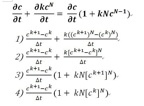 首先,区分一下符号,c^(k)表示第k次迭代的结果,应该和第一行公式中出现的k区分开。其次,如果k是常数,即第一行公式成立的话,那么迭代公式除了第二个,其他三个(其中第三个和第四个应该是N-1次方,而不是N次方)都是对的(同样要区分k)。最后,第三个格式是隐式格式,第四个格式是显式格式,一般而言,前者稳定性好,需要迭代求解。