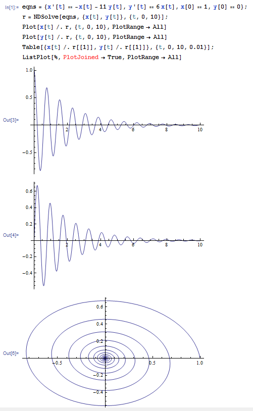 eqns = {x'[t] == -x[t] - 11 y[t], y'[t] == 6 x[t], x[0] == 1, y[0] == 0}