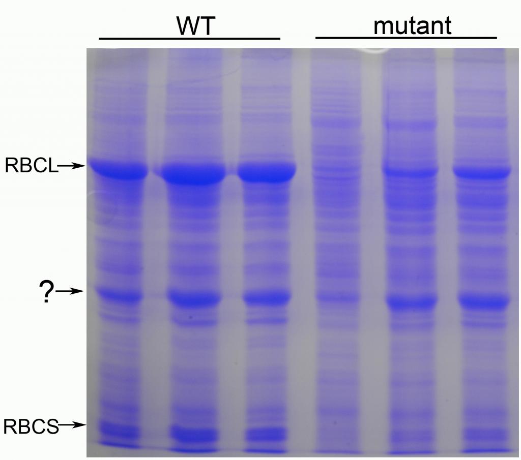如图所示提的野生型拟南芥和突变体拟南芥的总蛋白,通过maker对比可以找到RBCL和RBCS对应的条带,明显突变体中RBCL和RBCS含量减少了,但奇怪的是中间那条带是什么蛋白?感觉与叶绿体有关!还有一个奇怪的问题就是8%的胶跑电泳时看不到这么明显的带,12%胶跑电泳时这条带就非常明显。有没有高手可以解答? DSCN1924副本.jpg |