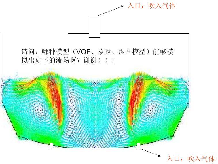 现在请教转炉复吹的问题,上面吹入的是氧气,下面为氩气,中间装有容器体积一半的钢液,我现在只想看钢液的流场图,用DPM计算的话,其整个熔池都变成钢液,用vof也是这样的,请问用什么模型能变成下面这个图啊,?