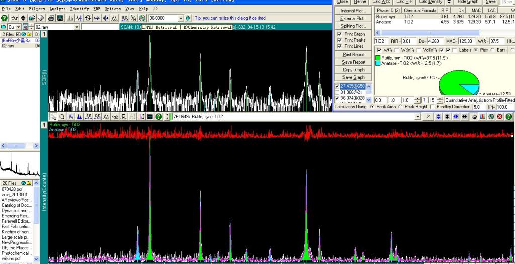 用jade 6.0 试了一下,但是数据质量不高,误差较大,锐钛钪87.5wt%,金红石12.5%, 仅供参考,祝好!