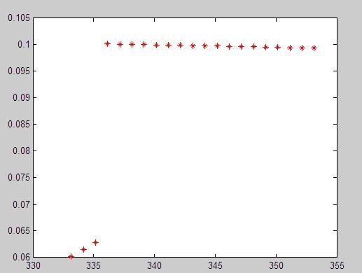 各位好,我编写了一个程序,结尾要用到plot画图功能,plot语句如下: plot(t_1,y, '* - r'),但结果画出来的图如下所示: 为什么图中只有点而没有用用线连接起来,求各位解答,谢谢 matlab1111.jpg |