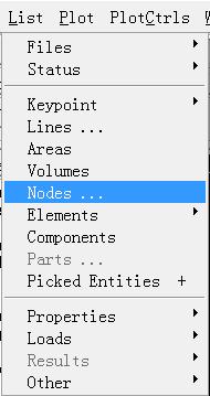 要列出节点结果,需要进入通用后处理 (Post1),在其中 点击 List Results ,然后在下拉菜单中选择 Nodal Results (节点结果),再选择要列表的结果 (与 plot results 类似),点击 OK 后则会列出当前选择集中的节点的编号及其结果值。