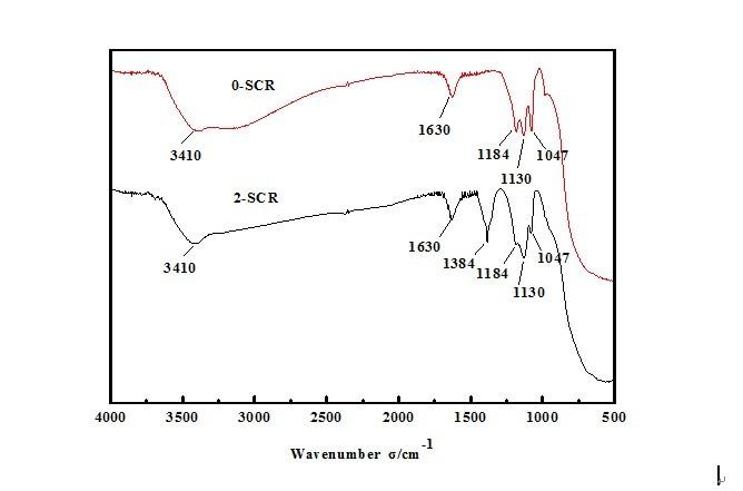 3410 cm-1: OH stretching of adsorbed water 1603 cm-1: OH bending mode of adsorbed water 1047, 1130, 1184 cm-1: M-O-M framework vibration mode of oxides. Or : 1130 cm-1: it is also possible to be the characteristic peak of SO4 1384 cm-1: is complicated, it might be due to NO3- nitrate peak |