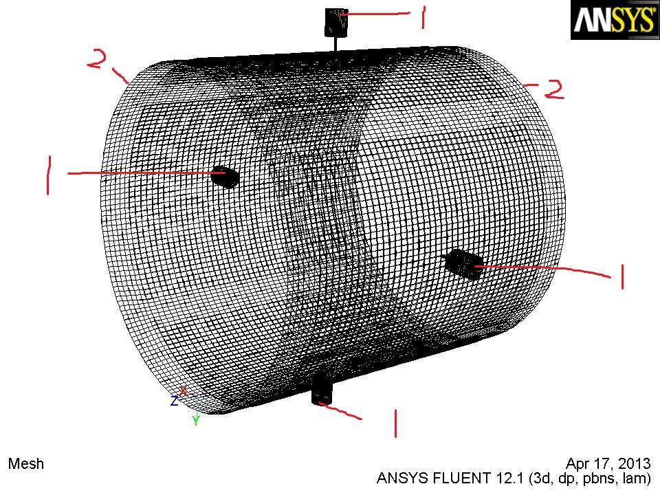 网格如下图所示,1表示四个压力进口,2表示出口。但是进行设置之后,就是没有温度变化。