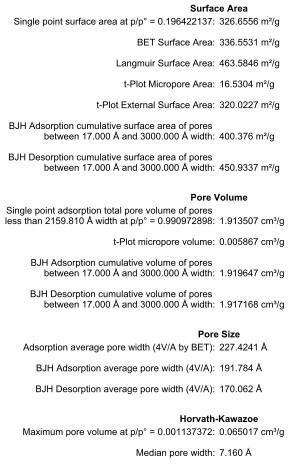测出来的等温吸脱附曲线如图,明显看出有微孔,但是给出的报告 t-Plot micropore volume却是负值: -0.082390 cm3/g,而且也没有给出t-Plot Micropore Area,我想知道微孔占多大比例,该如何获得呢? |
