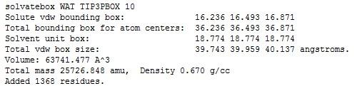 上面那个图不对,截错了,应该为:solvatebox myy TIP3PBOX 10 solute vdw bounding box : 49.327 41.467 53.940 total bounding box for atom centers: 69.327 61.467 73.940 solvent unit box : 18.774 18.774 18.774 total vdw box size : 72.535 64.737 77.076 volume :361923.915 A3 total mass 174342.130 amu, density 0.800 g/cc added 8290 residues |
