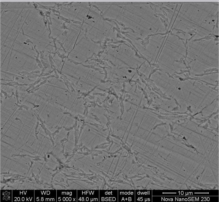 如果你所说的黑白两相之间的原子序数相差很大,应该可以用背散射区分出来,否则你按看金相方式做样品(磨抛腐蚀)看扫描效果未必比金相就好,这跟扫描成像原理有关。在扫描电镜下,样品原子序数相差很多,用背散射观察。表面凸凹不平引起的衬度适合用二次电子观察。你的样品中两相的原子序数差别可能并不大,因此无法用背散射区分开。建议做金相试样时将样品多腐蚀一会(当然这样的话样品就不太适合做进一步的元素能谱分析了),以期取得二次电子像形貌衬度上的差别。 你传的图片上是不是有许多划痕呀?你说说的“条纹”第二相是指那些像河流一样的东西吗? |