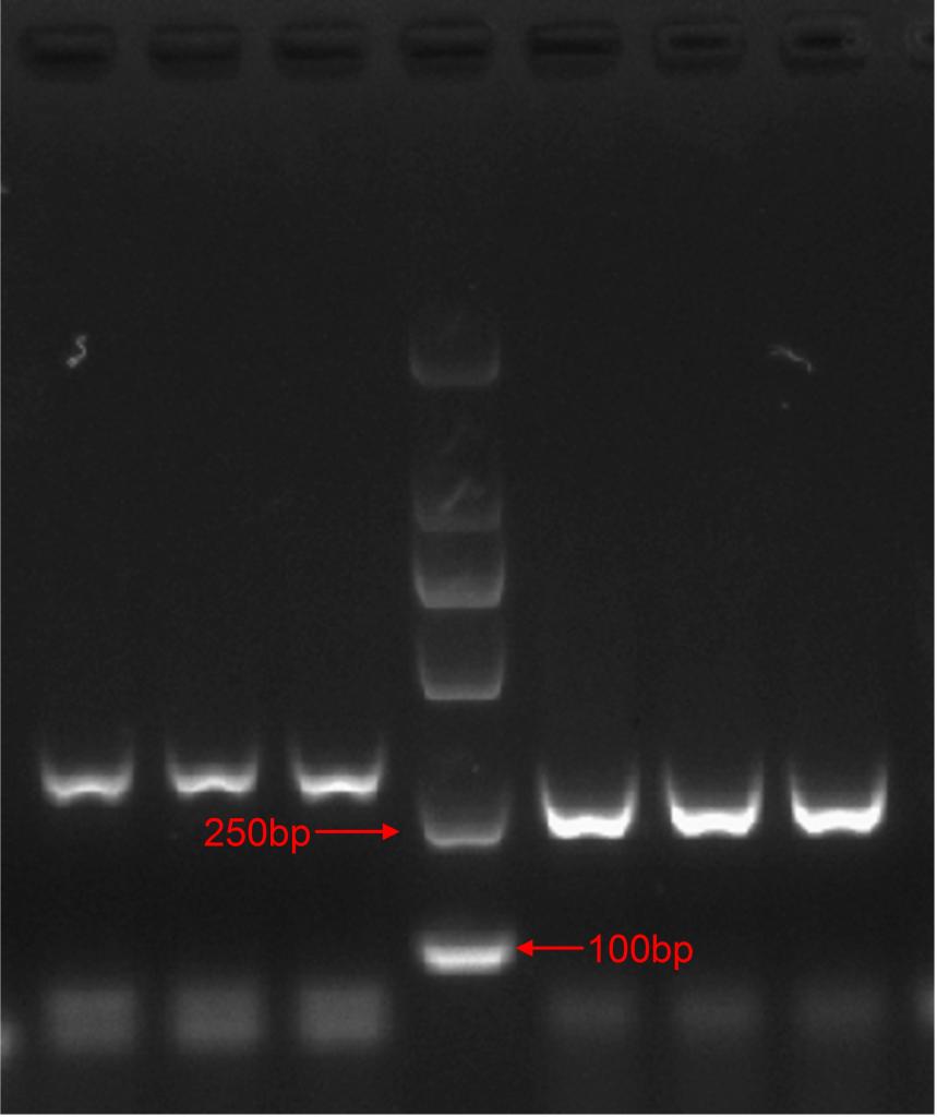 两个PCR产物,电泳后条带都是比预期的大100bp左右,预期大小分别为171bp和168bp。应该在100bp和250bp之间,现在电泳条带两个都在250bp之上,怎么回事呢?跑了两次PCR和电泳,情况完全一样。