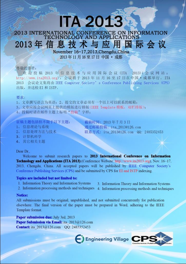 2013 International Conference on Information Technology and Applications Nov.16-Nov.17, 2013,Chengdu,China 2013年11月16日-17日 中国•成都 https://www.ita2013.org/ 2013 International Conference on Information Technology and Applications aims to bring researchers, engineers, students to the areas of information technology and applications to exchange new ideas and to explore new ground. ITA2013 provides a forum for sharing experience and original research contributions on theory, implementation, and application of information technology and applications. Researchers and practitioners are invited to submit their contributions to ITA2013. All accepted papers will be published by IEEE Computer Society’s Conference Publishing Services (CPS) and be submitted by CPS for EI and ISTP indexing. IMPORTANT DATES: Paper submission due: July 3rd, 2013 Acceptance notification: August 3rd, 2013 Regestration due: August 16th, 2013 Conference: Nov.16th-Nov.17th, 2013 截稿时间:2013年7月3日 注册截止时间:2013年8月16日 会议时间:2013年11月16日-17日 CALL FOR PAPER: Authors from the world are welcome to gather at this international event. After the conference, proceedings will be published based on the following topics, which include but are not limited to: Session 1: Information Theory and Information Systems: Source coding and channel coding Communication networks and communication systems security Network theory and technology Information System Modeling and Simulation Communication Theory and Systems Network Communication Theory and Technology Multimedia communication theory and technology Wireless communication theory and technology Computer communication theory and systems Artificial neural network Session 2: Information processing methods and techniques Signal and Image Processing Image understanding and recognition The multimedia information processing Detection and imaging system Intelligent Information Processing Remote sensing information acquisition and processing Sensing information extraction and processing Biological information processing and analysis Medical information detection method and technology Bionic information processing methods and techniques Session 3: Computer Science Computer education theory and technology Algorithm and its complexity Intelligent Systems and Applications Machine Intelligence basic theory and methods software theory and software methodologies Database Theory and Systems Embedded systems Parallel and Distributed Processing Computer system design and performance evaluation The computer system security assessment Computer Graphics Artificial Intelligence and Knowledge Engineering Data Mining Natural language processing technology Information Systems Security the quality of network services Internet of Things Multimedia and virtual reality technology PAPER SUBMISSION投稿: Paper submission will be done electronically via Email: ita_2013@126.com please add "paper submission" to the email title. 本会议通过邮箱投稿,投稿邮箱为:ita_2013@126.com 请广大作者在投稿时在主题上添加“投稿”二字 CONTACT联系方式: Email: ita_2013@126.com (contact ITA2013 organizer ) 注意: Official language is English in paper writing and presenting. Any submission must not have been, or will not be published elsewhere or submitted to another conference before the review notification date of this conference. All submissions will be peer-reviewed based on originality, technical quality and presentation. All submissions must be original, unpublished, and not submitted concurrently for publication elsewhere. 论文语言必须为英文。 杜绝学术作风不正。 更多信息,请点击进入官网: https://www.ita2013.org/ ITA.JPG |