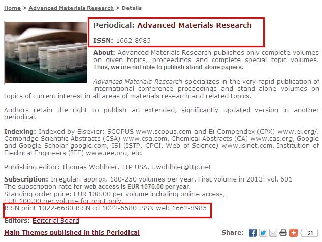 为什么:Periodical: Advanced Materials Research有两个ISSN: 1022-6680 和1662-8985