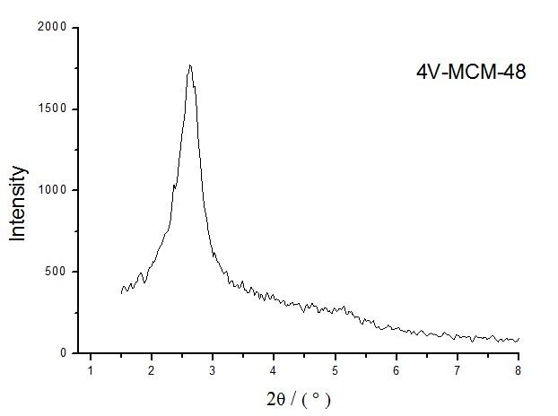 | 用过同样的药品做过MCM-41,V的负载量达到15%时仍能保持所有晶面、结晶度较高,两种顺序、有机无机钒源都做过,感觉先加钒的好做一些,后加钒的不易控制(重复性不好),有机钒源好做(但是真贵啊,都舍不得用),无机钒源麻烦些。另外,MCM-48的合成区间非常窄,加入钒源后可能体系的结构发生了改变,感觉应该注意一些。反应条件的影响也较大,都考察一下吧。看你的XRD谱图211晶面的有序度也不是非常好,220的峰有可能被盖住或是根本就没出来,所以跟你反应条件相关的可能性较大,再做做看 |