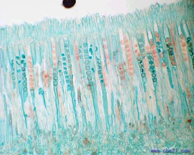 盘菌的子囊果就是子囊盘呀,我就是切的子囊盘,H.E染色看不到像上图的子囊。我是做的石蜡切片,不晓得是不是在制片的时候把子囊给洗脱掉了。