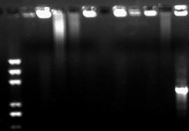 前一段做的转化长出的转化子,在抗性板上划线,用枪头沾取(划线上长满了菌,没有单菌落)在PCR体系中混一下,进行PCR反映。总共10个样品,只有第十个出现了目的条带。其他样品在点样孔以及点样口附近有明亮的带,师兄师姐帮帮忙,这是怎么回事?![]() PCR.jpg |