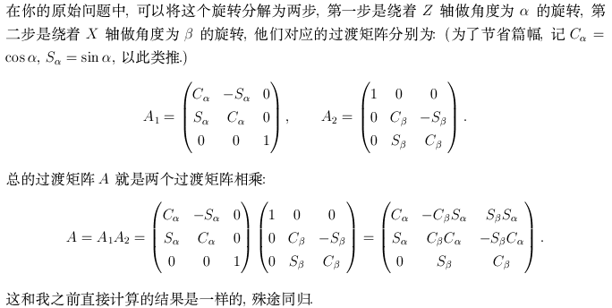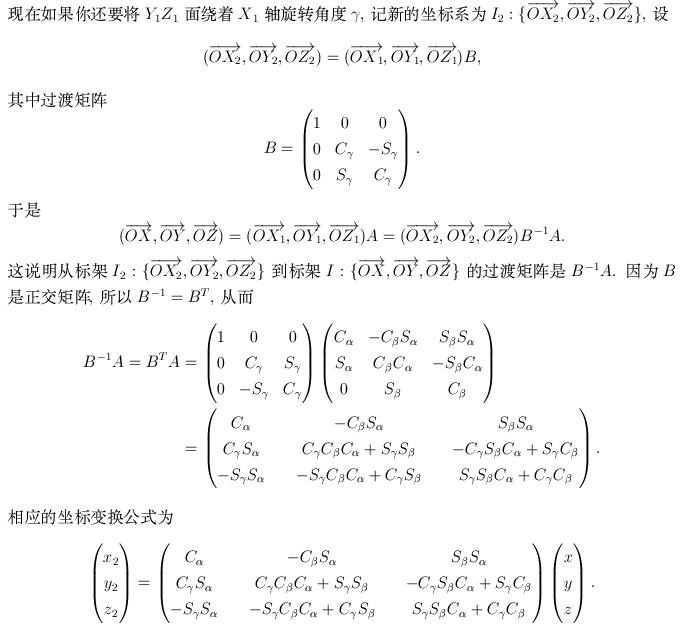 1. 关于X1Y1Z1坐标系, 你增加了"AD/BC边与地面平行"这个条件, 没错吧? 如果你确定的, 那可以如下分析: 根据你的描述, "X1Y1面就是与地面平行的面", 所以AD/BC边与X1Y1面平行, 注意到AD/BC边也平行于X轴, 所以X轴与X1Y1面平行, 但X轴与X1Y1面相交于原点, 所以X轴必定位于X1Y1面中, 这正是我原来给出解答后的疑问, 现在得到了证实, 因此我原来给出的公式就是你想要的. 2. 关于X2Y2Z2坐标系, 只需要在原来的过渡矩阵再右乘一个很简单的基本旋转矩阵就行了. 问题是你说"抬高85度", 又说"逆时针旋转c度(已知,假设为70度", 这个85度和70度岂不是自相矛盾? |