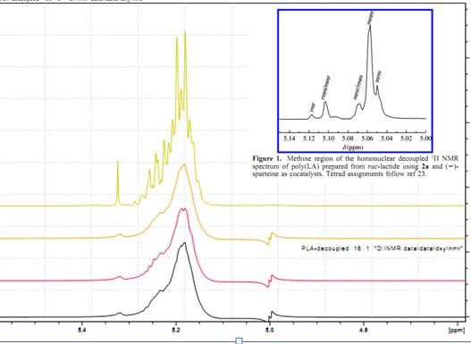 最近按文献,用D,L-lactide做高分子,合成了,但是想知道分子的具体tacticity的情况,做了去偶合氢谱,然后跟文献对比,峰分离没人家好啊,不好判断,有谁有经验如何做这个NMR实验吗?我选的峰也应该没错啊,就在1点几的那个双峰中间 [ Last edited by you3 on 2013-4-26 at 02:34 ] |