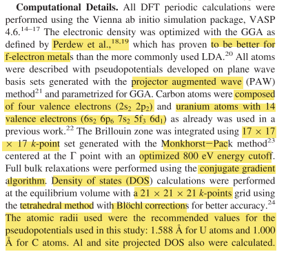 | 用的是Perdew形式的GGA框架,采用投影缀加波方法,原子组态可在PAW势文件中读取,K网格是布里渊区积分划分的网格,越密越精确,但是过密会造成计算量太大以及收敛的问题,K网格划分用的是M-K方案,这个方案你要去查资料,有介绍。态密度的计算用的是四面体积分方法,这类方法是相对于smearing方法而言的,smearing方法相当于引入一个电子温度来解决K网格不必过密带来的精度问题,特别是对金属体系,此外,也可以在大的K网格下采用四面体积分方法,四面体积分经常在态密度计算中使用,此外,Berry phase计算电极化中也用四面体积分多一些。原子半径是计算原子PDOS时候使用的,可以在PAW势文件中读取! |