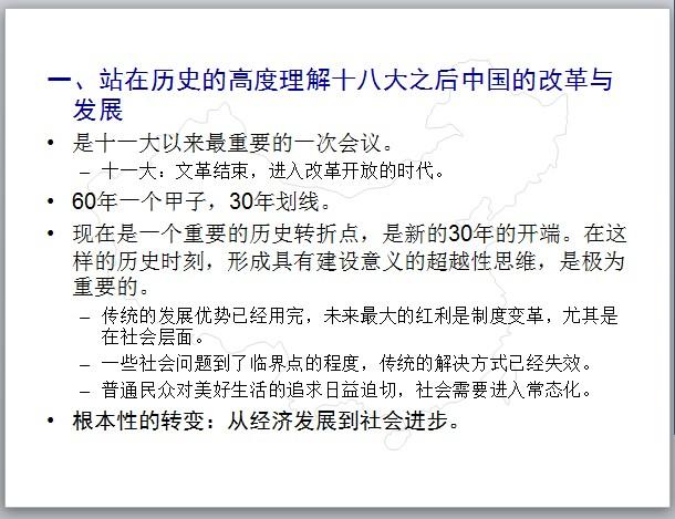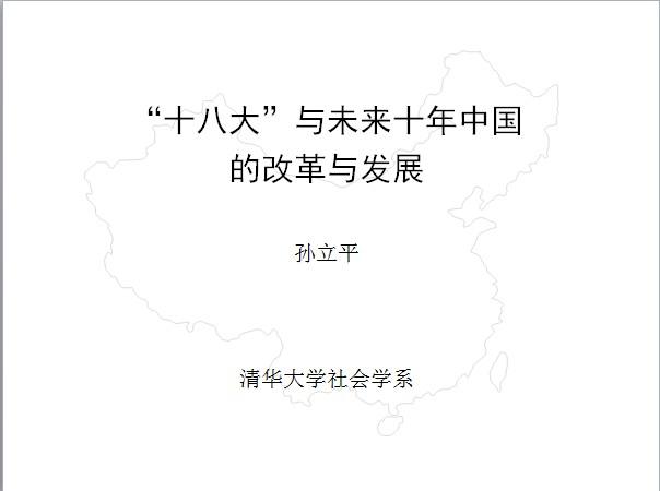 清华大学 孙立平教授讲述《“十八大”与未来十年中国的改革与发展(党政)》ppt,值得学习。看中国高层智囊如何看待中国的改革与发展,引发我们的深度思考! 1.jpg 2.jpg 3.jpg [ Last edited by 々暧-〃 on 2013-4-27 at 12:23 ] |