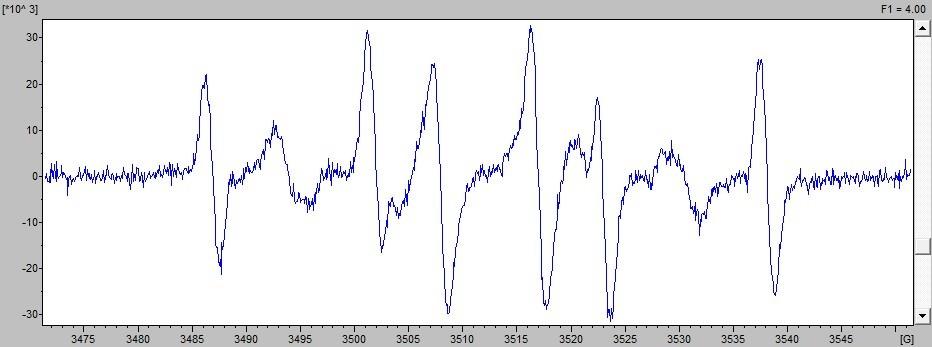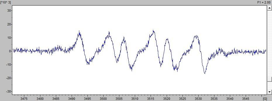 用DMPO 做捕获剂,甲醇做溶剂,进行光照后超氧自由基的捕获测试。 一图为刚开始的谱图,是正常的超氧自由基的六重峰。扫到第四遍的时候,变成了二图,就是多出来了头尾两个峰而且超氧的六重峰变形了。 想知道是DMPO发生了反应,还是说产生了别的什么自由基??? 求高手解答,大家帮忙讨论啊!~~ ![]() 一.jpg 二.jpg |