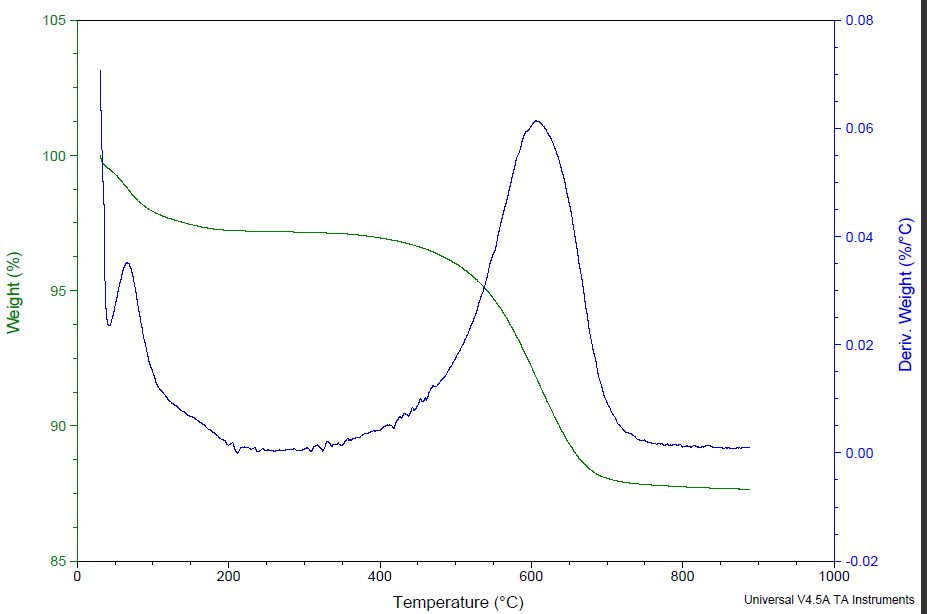 大家好! 最近正在做综合热分析(TG)测量结炭催化剂上的含碳量。我想问一下大家,怎样看TG曲线,根据已有的TG曲线设置下一次做TG分析时的最高温度呢? 下面是我做过的一个TG的曲线图,想让大家给帮忙看一下。 多谢各位了 TG.gif |