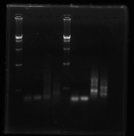 以反转录得到的双链cDNA为模板,设计特异性引物,Forward primer:5’-GGCATCCATGTCGCATCTGT-3’;Reverse primer :5’-TCTGACCCTATTGAGCCCTCT-3’。通过PCR扩增获得目的基因OspHT7。 取0.5ml PCR管,一次加入下列试剂: 反应体系 25uL Tamplate cDNA 0.75uL ddH2O 16.5uL 10×PCR Buffer 2.5uL Mg2+ 1uL dNTP 2uL primer Forward 1uL Reverse 1uL Taq 0.25uL 设定PCR程序: PCR循环: 94℃ 预变性5min 94℃ 60s 55℃ 60s 30个循环 72℃ 90s 72℃ 10min 4℃ 保存。 电泳鉴定:采用1%的琼脂糖凝胶电泳进行分析,其中电泳加样体积均为10uLDNAMarker为D2000。紫外灯下观察结果。 拍照观察:采用凝胶图像分析系统,对电泳图条带进行拍照分析。 |