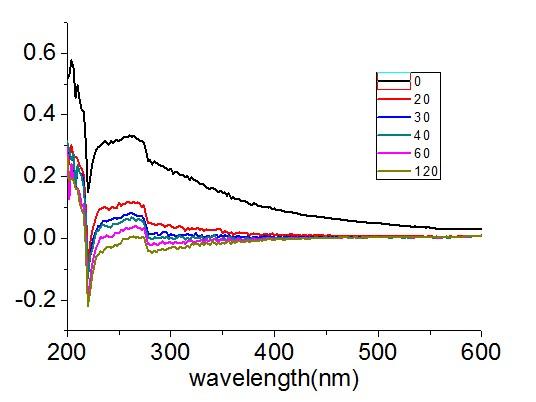 本人想做下臭氧降解腐殖酸后的UV-vis图,可是出现了倒峰,求助各位大侠是怎么回事?