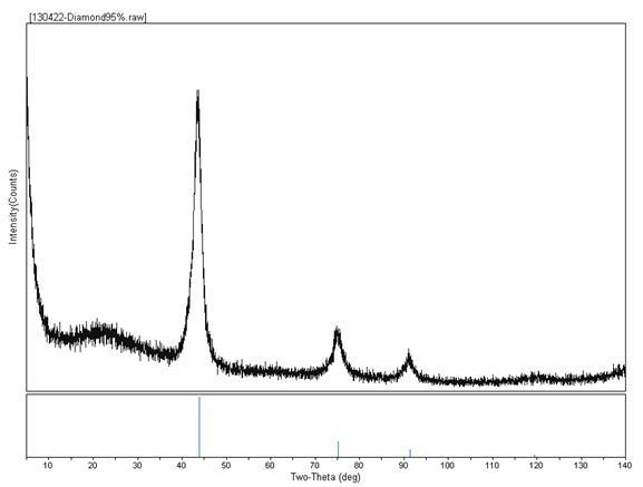 | 第一题显然是金刚石的。立方相元素材料在这么大范围内只有这么少的峰,基本就是金刚石结构(体心立方,空间群:Fd-3m,227号)。元素材料具有这种结构的基本是C和Si,而Si的晶胞参数较大,C的正合适。第一条衍射峰为(111)峰,2theta为43.62度,这样可以算出晶胞参数a=1.732*1.5418/2/sin(43.62/2)=3.5938埃(假设用的是Cu耙)。又测的(111)峰的半高宽为2.09度,所以根据谢乐公式,可以估算其晶粒大小为D=0.89*1.5418/(2.09/57.3)/cos(43.62/2)=40.5埃=4.05nm. |