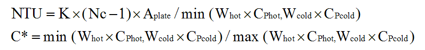 NTU=K*(NC(1)+NC(2)-1)*Aplate/min(Whot*Cphot,Wcold*Cpcold);