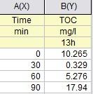 提取了不同反应时间的反应物测定TOC,TOC含量随着反应时间的增加而增大,但其脱色率是逐渐降低的,并且色度最小的反应物TOC最大而且超过了甲基橙原溶液的TOC,这是为什么?望高人解答!急急急~~~~ 图为我的数据 V8_(46~3H]`ZK57]4%$H[5F.jpg |