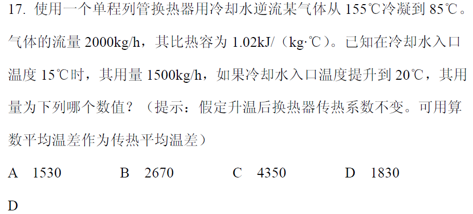 从q=KST公式可知,qk不变,t也不变,用换热量计算出冷却水从15上升到36.78度,改用后从20度上升到31.78度,换算流量为2772kg/h,最接近答案B
