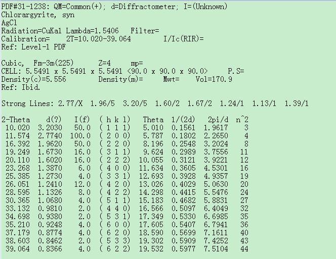 在画AgCl的XRD的标准图谱中需要的原始数据是不是可以在JADE中输出?我今天找了一下,输出了一个txt的数据,可是里面的2倍角度只是大约从10°到40°,画图还不够用。可能是我的操作不对,请问有没有高手帮我解决这个问题? 告诉我怎么输出或者把那些数据复制到这里作为回复都行,嘿嘿 谢谢! 捕获.JPG |