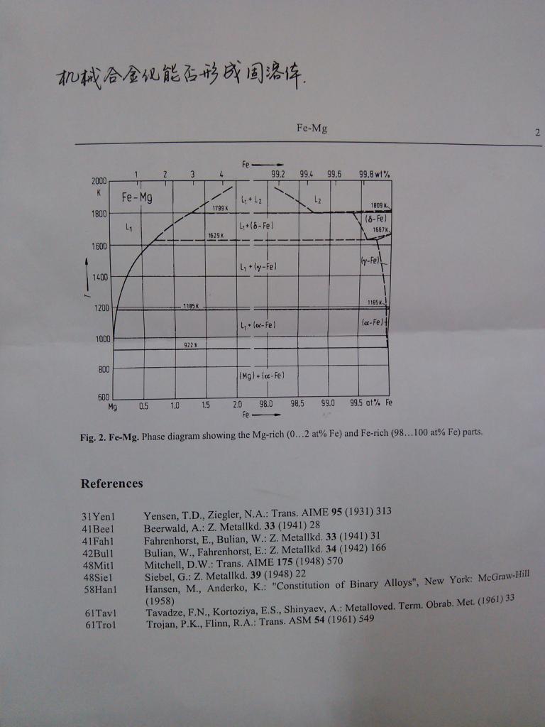 利用机械合金化的方式(高能球磨),能否将镁固溶到铁的晶格中? 我附加了一张Fe-Mg的二元相图,最好先从理论上解释一下~ 添加的镁含量很低0.5%,利用XRD无法判断,谁知道从理论上先解释一下,或者介绍个好的检测方法也行,万分感谢! IMG_20130503_103501.jpg |