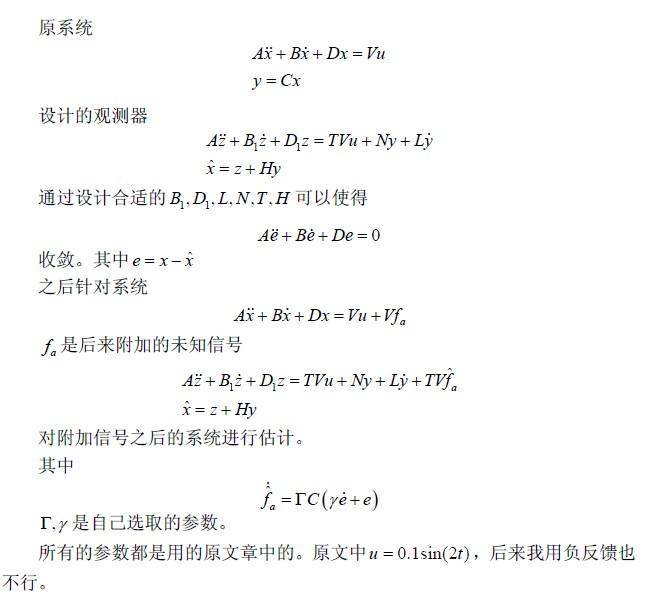 看了一篇二阶系统未知输入观测器的文章,想按着论文中的思路做个仿真,但是怎么也出不了结果,所有的数据都是用的原文中的,但是系统还是发散,麻烦高手帮忙解答一下是为什么。具体看图片吧。
