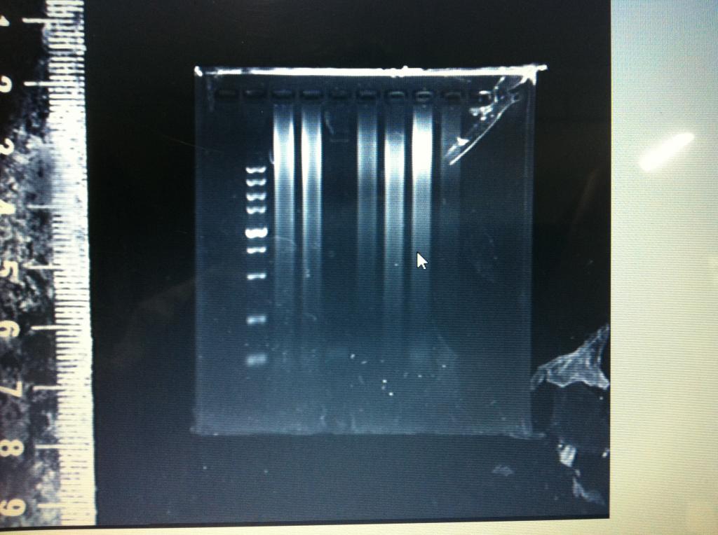 顺便说一句,从你跑出的marker来看,这块胶做的不太均匀,琼脂糖明显没融好。