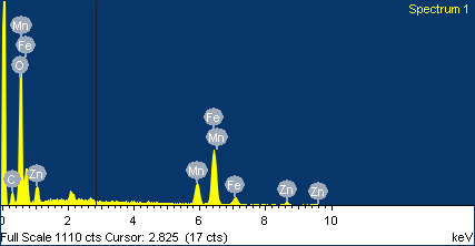 无机物的能谱图,图谱识别其实跟红外啥的类似的。EDS是由电子束打在样品上(深度为几个微米)激发出来的特征谱线组成。能谱只能分辨4号元素以上的物质 横坐标表示谱线的能量,某个元素会在特定的能量位置出峰,原子序数低的一般一个峰,能量也低,原子序数高的峰比较多,对应其电子层比较复杂 纵坐标是谱线的累积强度,同一种元素也可以看到其一套特征谱线之间的大概强度比。累积强度与元素在样品中的含量密切相关。 你的图说明了,被检测物质中含有C O Fe Zn Mn几种元素。 你对照标准能谱图,你还可以得到哪种位置是哪种谱线。比如Mn的K阿发线之类的 |