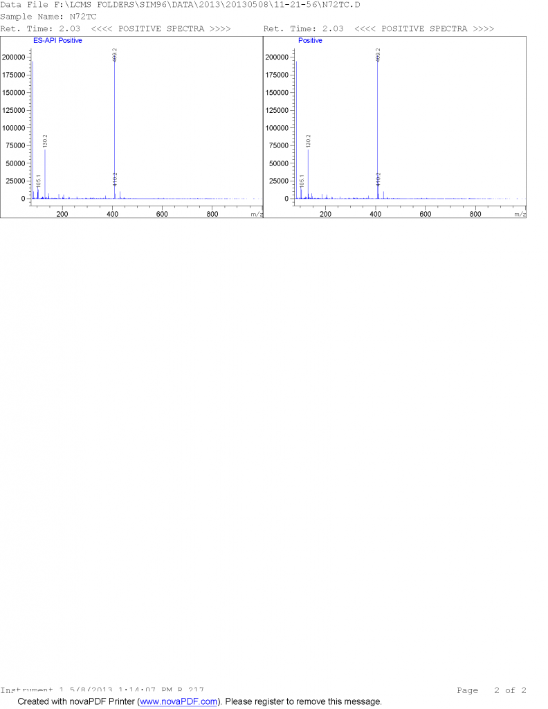 最近通过分离提纯公司分离提纯一个产物,液相214nm和254nm波长下显示一个峰,而该产品的TIC峰右侧却多了一个TIC峰(2.461min那个峰),像这种情况该如何解释,是产品不纯的缘故吗?谢谢!! LCMS_页面_1.png LCMS_页面_2.png |
