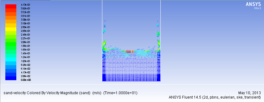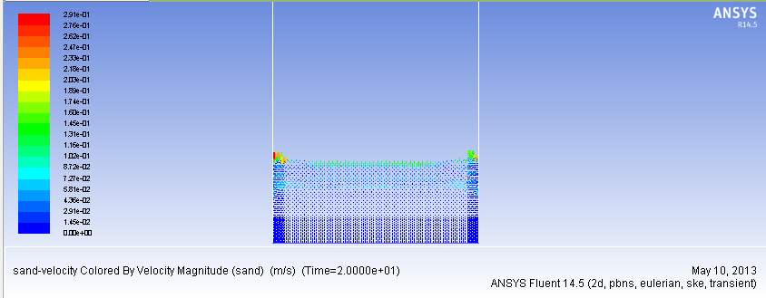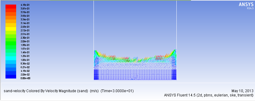 我用欧拉法模拟二维喷动流化床气固两相流,最后是用adapt的方法形成高度为100mm的床层。下图是10s、20s、30s时颗粒的速度图,可是为什么颗粒速度一直向下,而且没有一点点环核区的意思?