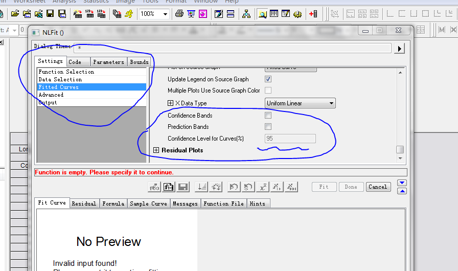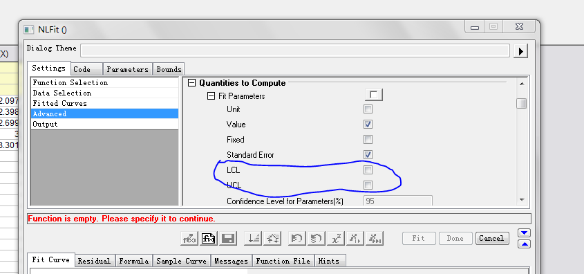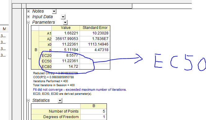 我用你的数据进行了试验,个人感觉结果没有问题。 对于置信区间,默认的是95%,可以修改,在Open Dialog的对话框,Settings----Fittde Curves-----Fittde Curve Plot-----Confidence level for Curves。这里可以显示的。 对于ED50,这里面是没有的,我查了Origin的帮助,里面就没有这个概念,而这个回归结果中有EC50,不知道二者可否替换。 以下是我百度的这二者的概念,个人感觉是可以替换的,至少是有关系的, ED50:半数有效量(50% effective dose, ED50)在量反应中指能引起50%最大反应强度的药量,在质反应中指引起50%实验对象出现阳性反应时的药量。 EC50,半最大效应浓度(concentration for 50% of maximal effect,EC50)是指能引起50%最大效应的浓度。LD50/ED50、TD50/ED50、TC50/EC50等统称为治疗指数,是一类药物的安全指标,通常其值越大越安全。需注意这些指标只反映治疗作用与急性毒性的关系,并不能反映慢性毒性、过敏性。 |
