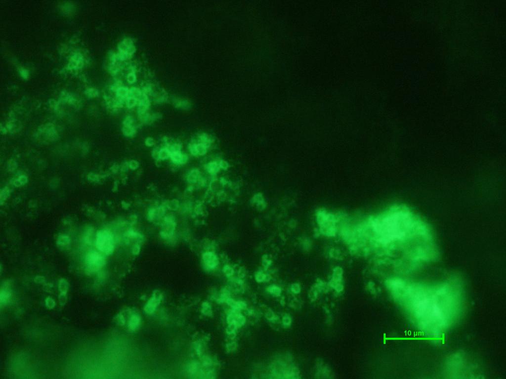 最近在做污水活性污泥中氨氮细菌的FISH,做出的图片感觉不是细菌的发光,哪位大侠帮忙看一下是不是目的细菌发光,还是污泥中的一些自发光或者是其他原因? 荧光图片.jpg [ 来自科研家族 污水污泥家族 ] |