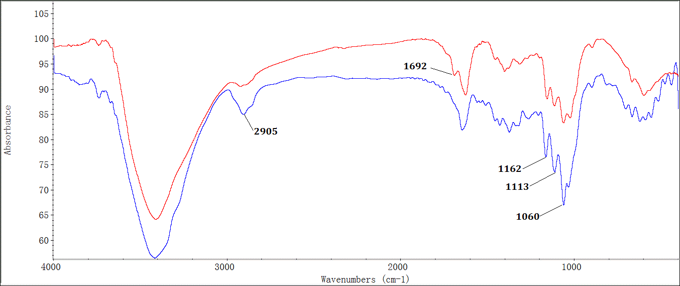 各位大侠,麻烦帮我看一下这张红外图中新出现的1692是什么峰,是醛基还是羰基啊?1060,1113,1162是葡萄糖是羟基峰还是葡萄糖环峰啊?感激啦! IR图说明:纤维素氧化前后的红外对比 总3.gif |