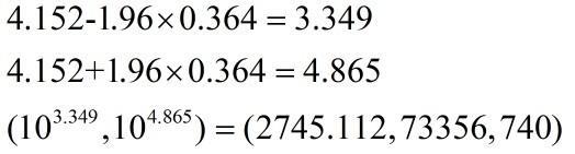 | 符合对数正态分布的一组数如何求它的95%置信区间?平均数为:4.152,方差为:0.364.注意是“对数”正态分布哦! |